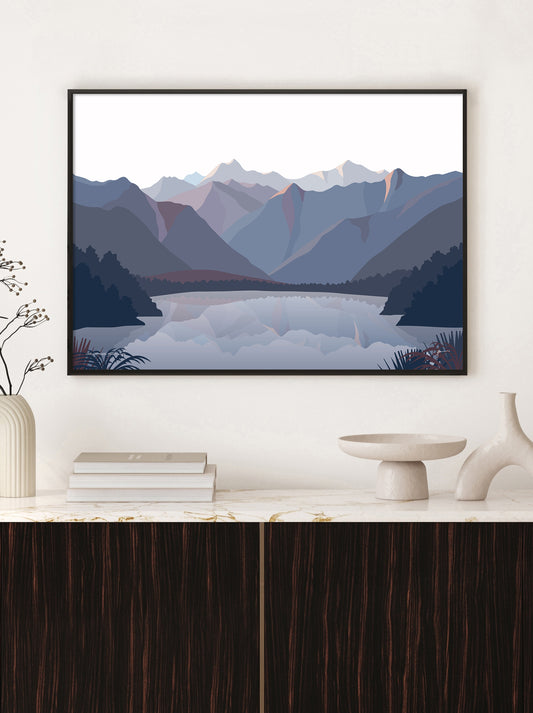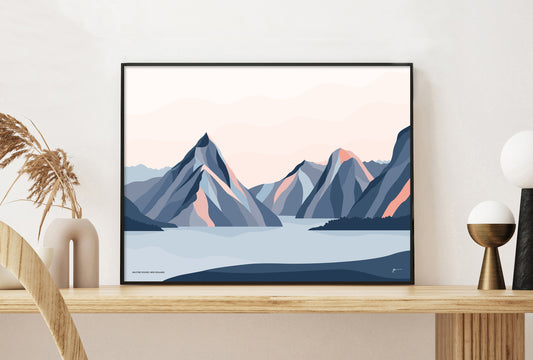 Milford Sound Mountains, New Zealand. Modern Mitre Peak Art Print