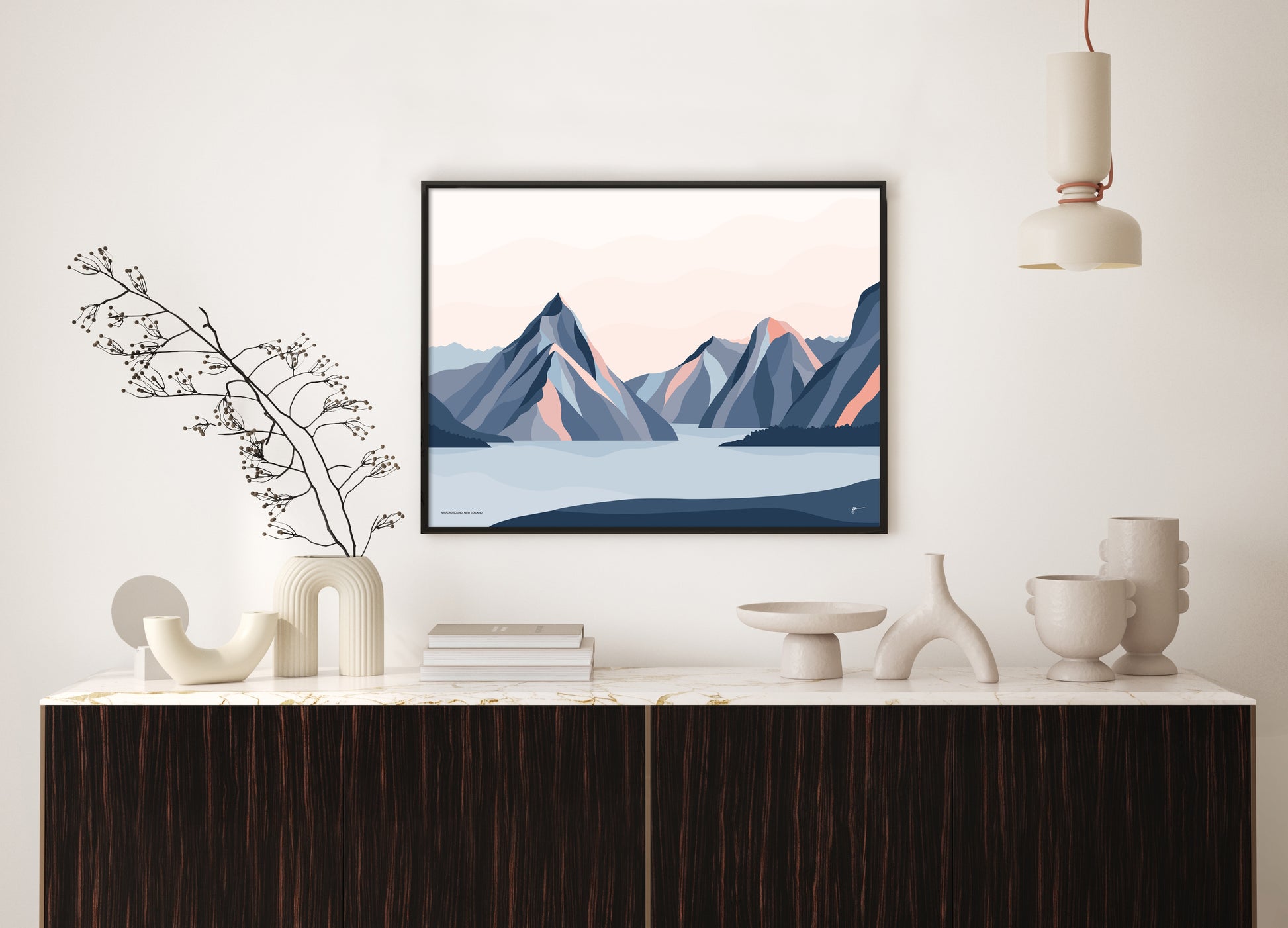 This modern Milford Sound landscape art print depicts the stunning views of Mitre Peak and the surrounding mountains in Fiordland, New Zealand. This artwork captures Milford Sound's beauty in a contemporary and slightly abstract style.
